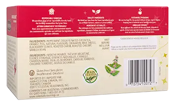 Peppermint, decaffeinated green tea, orange peel, natural flavours (including vanilla, mint), cinnamon, milk thistle, blackberry leaves, roasted carob, roasted chicory, vanilla bean.