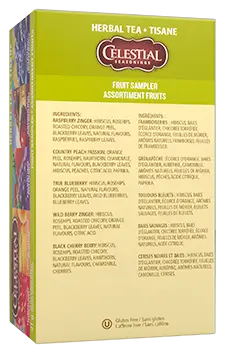 Raspberry Zinger: Hibiscus, rosehips, roasted chicory, orange peel, blackberry leaves, natural flavor, raspberries, raspberry leaves.