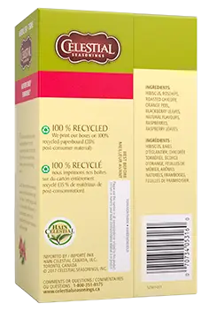 Hibiscus, rosehips, roasted chicory, orange peel, blackberry leaves, natural flavors (including raspberry, strawberry champagne, French vanilla, soy lecithin), raspberries, raspberry leaves. Contains Soy.