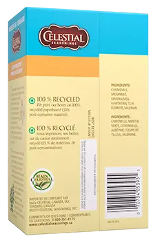 Chamomile, spearmint, lemon grass, hawthorn berries, tilia flowers, orange blossoms, valerian.