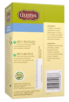 Chamomile, spearmint, lemongrass, natural french vanilla flavour, tilia flowers, blackberry leaves, orange blossoms, hawthorn, rosebuds.