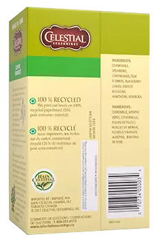 Chamomile, spearmint, lemon grass, tilia flowers, blackberry leaves, orange blossoms, hawthorn and rosebuds.